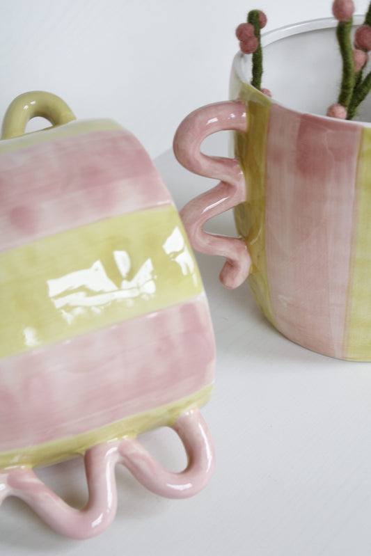 Keramik-Blumentopf rund – Rosa & Senfgelb gestreift mit Henkeln