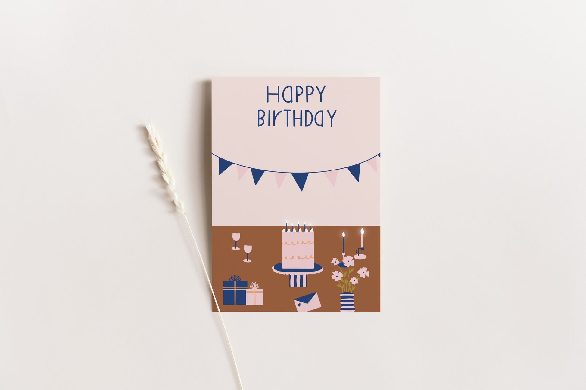 Happy Birthday Postkarte A6 – Festliches Kuchenmotiv mit Girlande und Geschenken – Von Lief Store