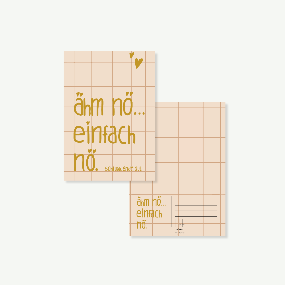 Manchmal muss man einfach „Nö!“ sagen! Diese lustige Postkarte ist das perfekte Statement für all jene, die klare Worte lieben. Gedruckt auf 300 g/m² Offsetpapier, überzeugt die Karte nicht nur mit ihrem humorvollen Design, sondern auch mit ihrer hochwertigen Verarbeitung. Die Karte im DIN A6-Format bringt ein bisschen Spaß und Leichtigkeit in den Alltag – ideal für jeden, der auch mal „nein“ sagen möchte.