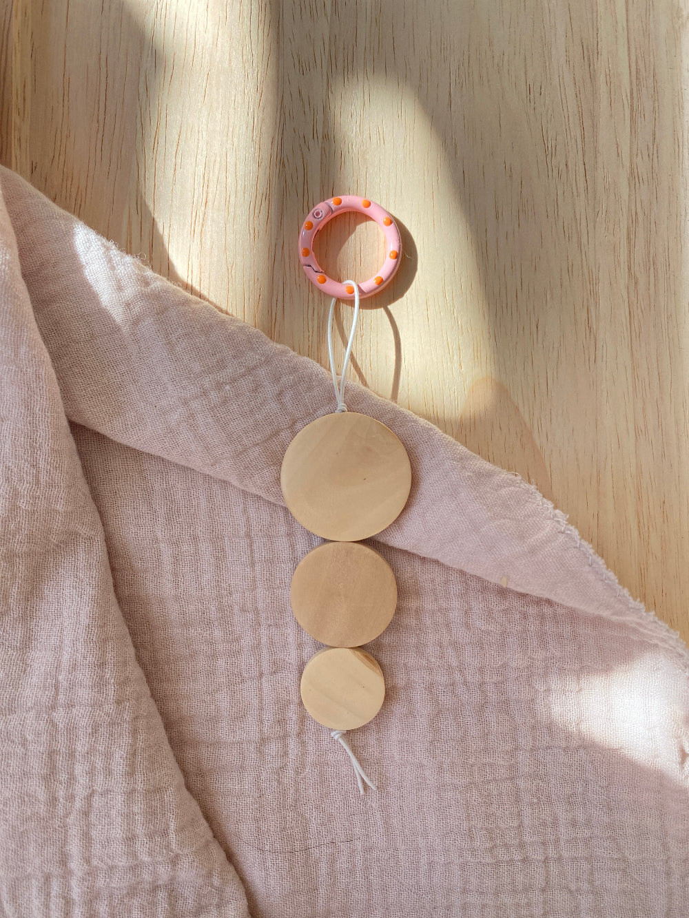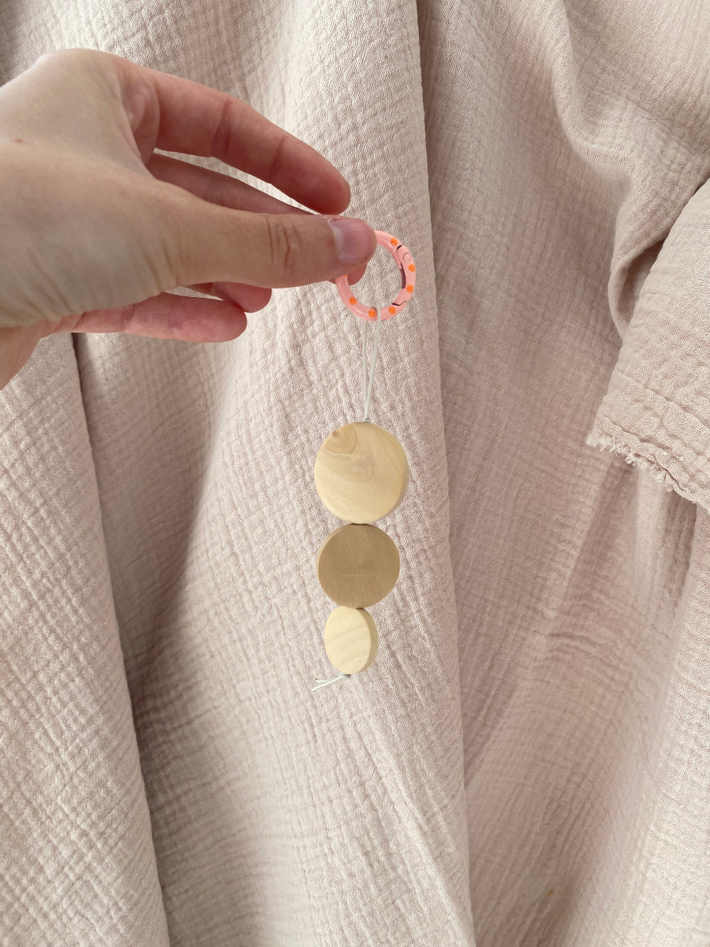 Material: Drei Holzperlen, aufgefädelt auf ein helles Elastikband.